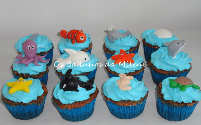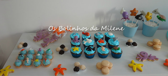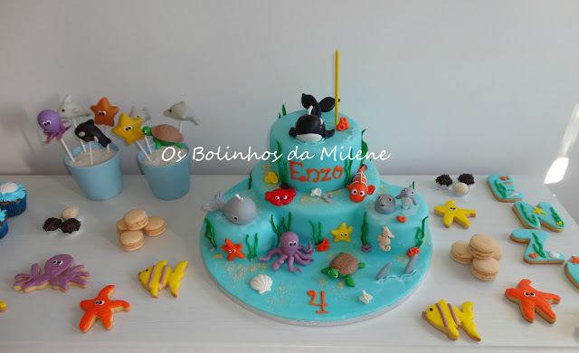 Orca, golfinho, tubarão, Nemo, baleia, polvo entre muitas outras criaturas marinhas modeladas em pasta de açúcar
